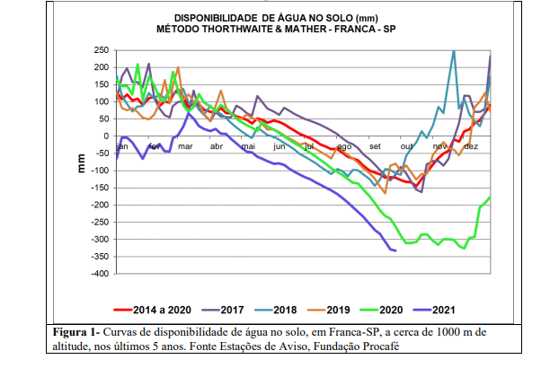 Na figura 1 podem ser observadas as curvas de deficit hídrico dos últimos 5 anos, em área da Fda Experimental da Fundação Procafé, em Franca, a cerca de 1000 m de altitude. Verifica-se que, na curva da média normal, registrada entre 2014 e 2020 (linha vermelha), ocorrem deficiências de água no solo a partir de julho, até novembro, chegando a acumular quase 150 mm de déficit. Nas curvas dos últimos 5 anos observa-se que, em todos os anos, a condição de disponibilidade de água no solo esteve inadequada, ora atingindo o déficit muito cedo, como em 2018, ora com menor período de déficit porem superando 150 mm (2017), ora com período de déficit estendido(2019) , e, principalmente, com déficit muito severo, atingindo mais de 300 mm(2020 e 2021).