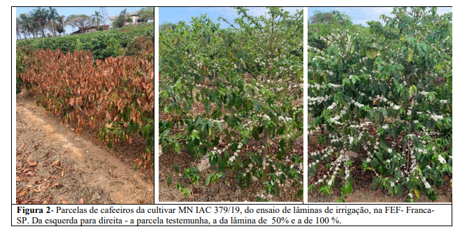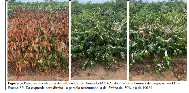 Em ensaio mais recente, na Fazenda Experimental de Franca, com estudo, em andamento, de diferentes lâminas de irrigação, verificou-se que, em função dos déficits hídricos severos, dos dois últimos anos, e se tratando de cafeeiros nas primeiras safras, as parcelas das plantas testemunha, não irrigadas, tiveram a folhagem quase totalmente queimada. Nas parcelas com lâmina de 50% (de reposição da evapo-transpiração), houve uma desfolha em nível maior, porém as plantas resistiram, sem queimas e na reposição de 100% as plantas se mostraram bem enfolhadas e com boa perspectiva de produção na próxima safra. Como este ensaio compreende duas cultivares (Catuai Amarelo IAC 62 e MN IAC 379/19) foi possível observar, inicialmente, que o Catuai se comportou melhor, mesmo com lâminas menores. As fotos nas figuras 2 e 3 ilustram as parcelas desse ensaio.