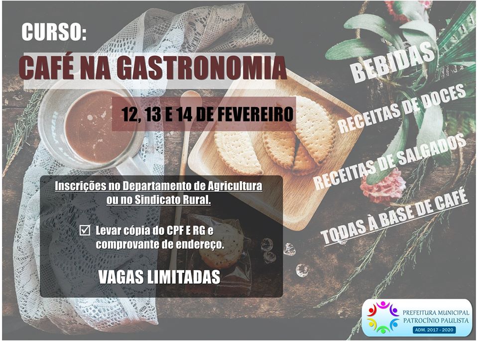A Prefeitura Municipal Patrocínio Paulista através do Departamento de Agricultura e Abastecimento, em parceria com Sindicato Rural/SENAR, abre as inscrições para o Curso de Café na Gastronomia, que será realizado nos dias 12/13/14 de fevereiro.