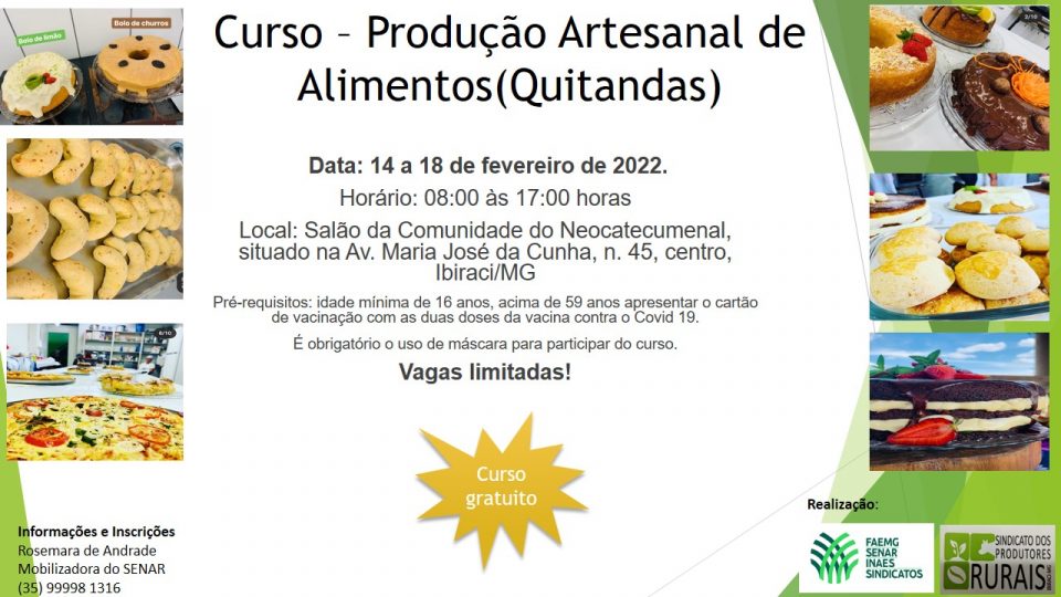 Cursos e PalestrasCurso de Produção Artesanal de Alimentos (Quitandas) do Sistema FAEMG/SENAR MINAS/SINDICATO DOS PRODUTORES RURAIS DE IBIRACI com inscrições abertas! por Fabrício Guimarãesfevereiro 8, 2022fevereiro 8, 202201160 Compartilhar0 Serão realizadas varias receitas: BolosRoscasBolachasSalgados assadosBiscoitos-Pão de queijoPães