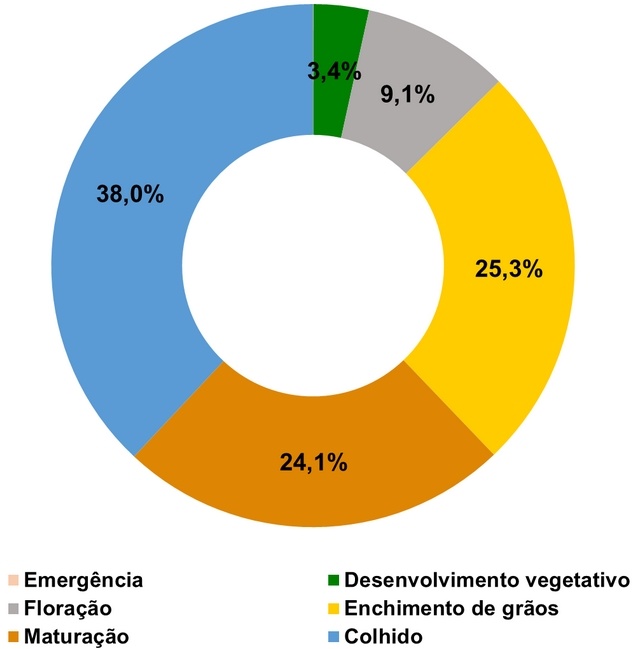 Com 38% do total nacional colhido, a safra 2023/24 caminha em ritmo acelerado para o seu encerramento, visto que 49,4% estão em enchimento de grãos e maturação, 25,3% e 24,1% respectivamente.
