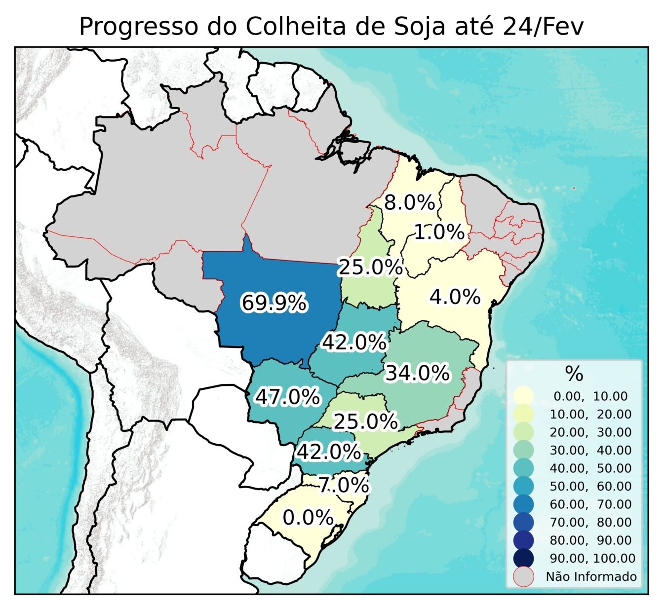 - Mato Grosso: 69.9% das áreas foram colhidas (+8.6% em relação à semana passada), diminuição de 7.2% em comparação à safra anterior.