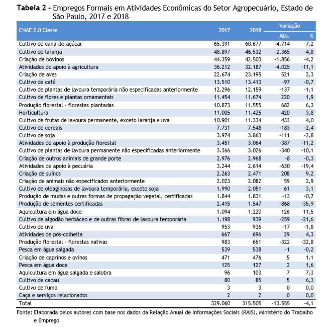 O cultivo de laranja, segunda atividade em empregos, 14,8% do total, apresentou declínio em 4,8% correspondendo na eliminação de 2.365 vagas. Dados do Instituto de Economia Agrícola evidenciaram queda de 200 mil toneladas de laranja entre os anos de 2017 e 20184, o que pode ser um indicativo da redução de mão de obra na colheita dessa cultura, etapa do sistema produtivo que mais demanda trabalhadores.