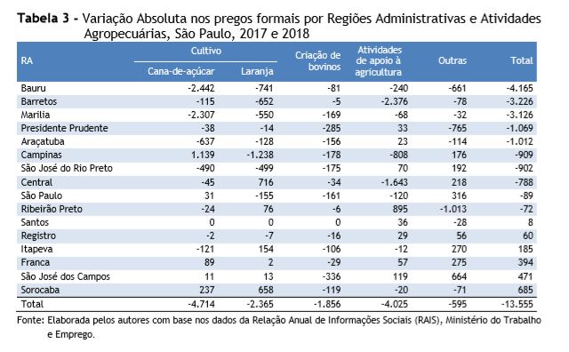 Observando-se a distribuição dos empregos formais nas 16 Regiões Administrativas do Estado de São Paulo, houve redução dos empregos em 10, das quais se destacam principalmente as de Bauru e Marília, com perdas de 4.165 e 3.126 empregos formais, respectivamente (Tabela 3). Em ambas as regiões, a principal atividade econômica que contribuiu para essas perdas foi o cultivo de cana-de-açúcar, com eliminação de 2.442 empregos em Bauru e 2.307 em Marília.