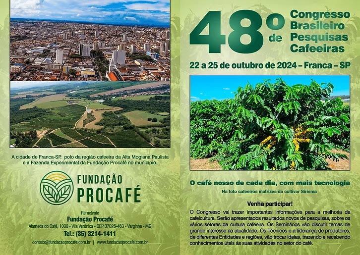 | Está quase lá! É com grande entusiasmo que anunciamos o 48º Congresso Brasileiro de Pesquisas Cafeeiras, que ocorrerá de 22 a 25 de outubro. Este congresso reunirá especialistas, pesquisadores e profissionais para discutir as mais recentes inovações e pesquisas relacionadas ao café. O evento contará com a apresentação de diversos trabalhos, que serão publicados no livro dos Anais e disponibilizados no site da Fundação Pro café. Além disso, haverá sessões de apresentação oral, permitindo um rico intercâmbio de ideias e experiências entre os participantes. Como parte das iniciativas do congresso, a Plataforma Pro café oferecerá um desconto de 10% para todos os usuários durante os dias do evento. Essa é uma excelente oportunidade para aprofundar seus conhecimentos, economizando e aprendendo com os melhores especialistas em cafeicultura do Brasil! Fique atento que nos próximos dias, traremos mais detalhes sobre as novidades que preparamos para você. Não perca a oportunidade de se conectar com especialistas, descobrir inovações e garantir seu desconto exclusivo! |