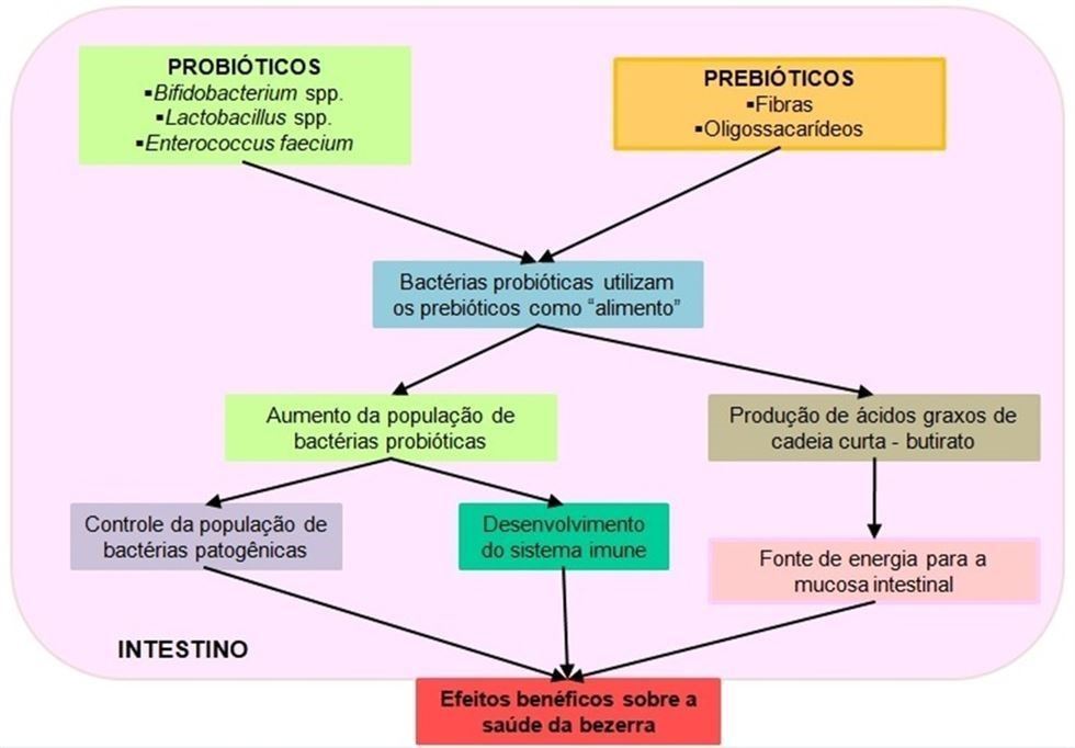 Figura 2 – Ação das bactérias probióticas e prebióticos no intestino e seus efeitos na saúde das bezerras.