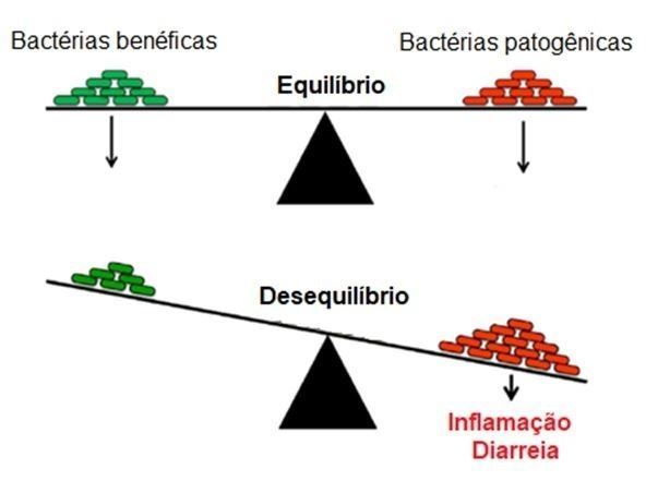 Figura 1 – O desequilíbrio das populações de bactérias presentes no intestino com diminuição de bactérias simbióticas e aumento das bactérias patogênicas resulta em inflamação intestinal e diarreia.