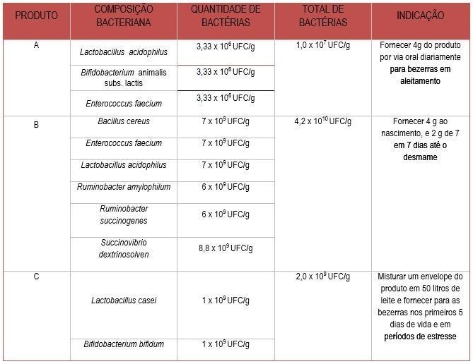 Atualmente existem no mercado muitas opções de probióticos para as bezerras em aleitamento, sendo eles administrados por via oral ou juntamente com o leite ou ração. O número de espécies bacterianas e quantidade presentes nos probióticos comerciais são variadas. Na tabela 1 estão alguns exemplos de probióticos comerciais utilizados para bezerras em aleitamento.