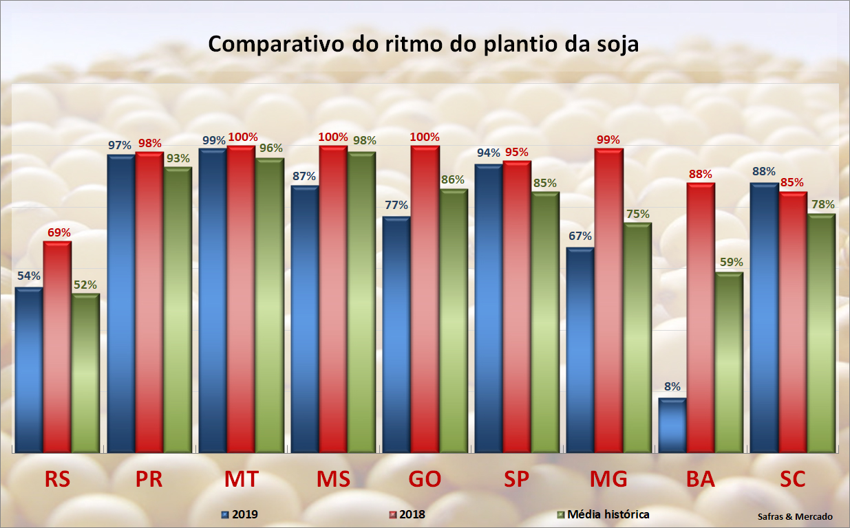 Se a comparação for realizada com o mesmo período de 2018, pelo menos 4 estados já deveriam ter concluído os trabalhos. Destes, somente Mato Grosso está realmente perto de finalizar, com 99% da área de 9,9 milhões de hectares já semeada. Mato Grosso do Sul, que enfrenta secas, plantou 88% até agora (100% no ano passado), Goiás está com 77% (100% no ano passado) e MInas Gerais 67% (99% no ano passado).
